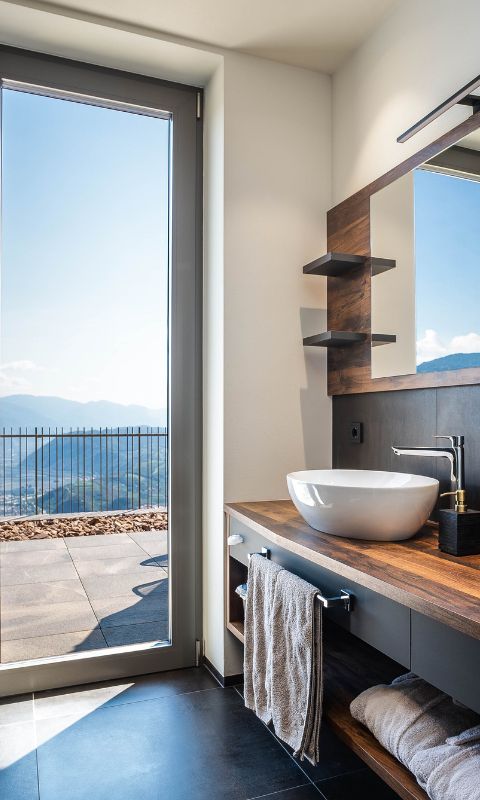 Noan Panorama Suiten: Das sind zwei exklusive Ferienwohnungen in herrliche ruhiger Lage nur 15 Minuten nördlich von Bozen, mit imposantem Blick über die Stadt, die Dörfer der Weinstraße und die Berge der Umgebung – bis hinein zu Rosengarten und Latemar, Teil des Weltnaturerbe der Dolomiten.