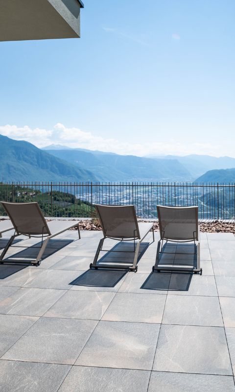 Die großen Terrasse lädt zum Entspannen und bietet eine atemberaubenden Blick über den Talkessel von Bozen und die Weinstraße.